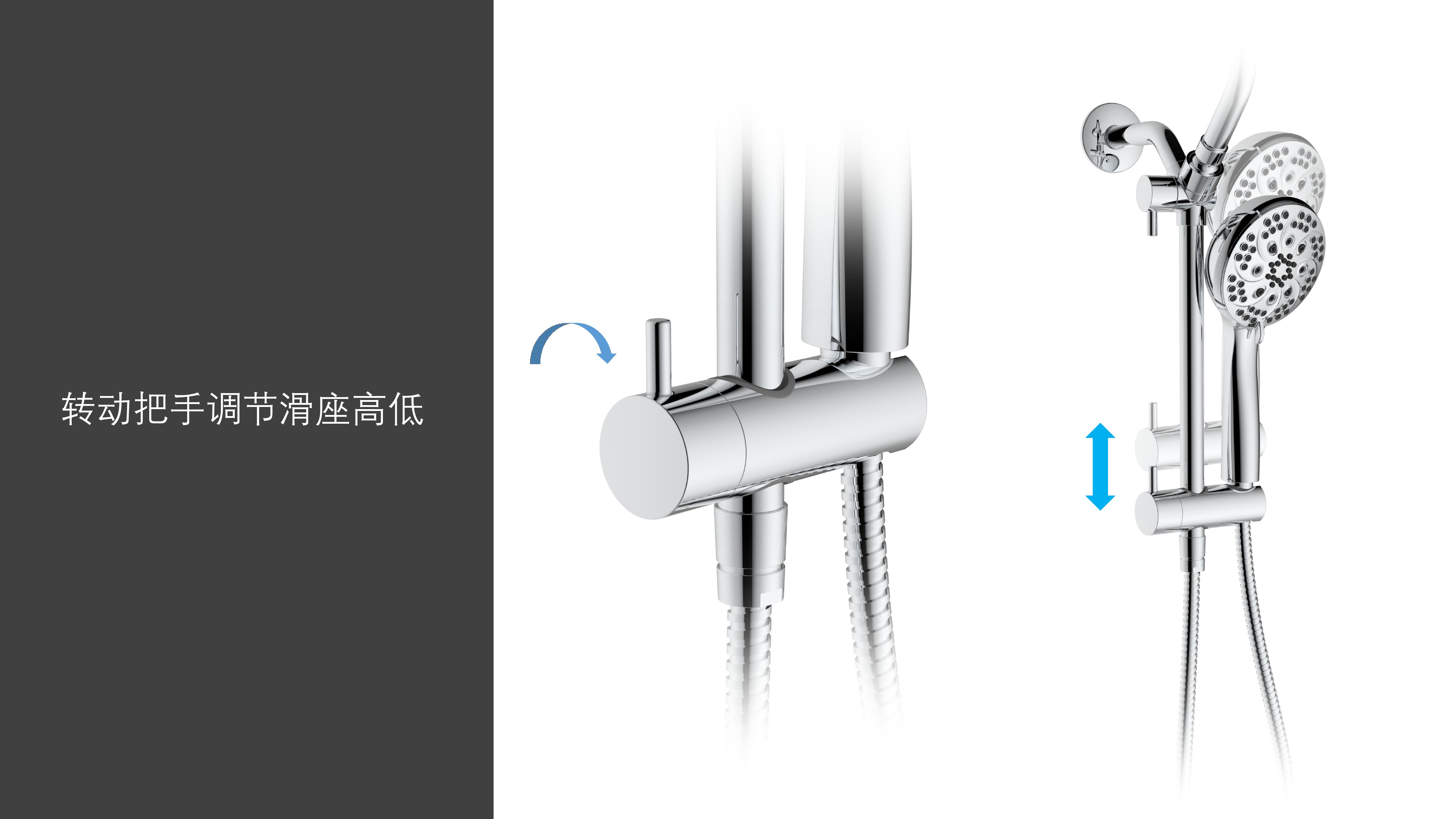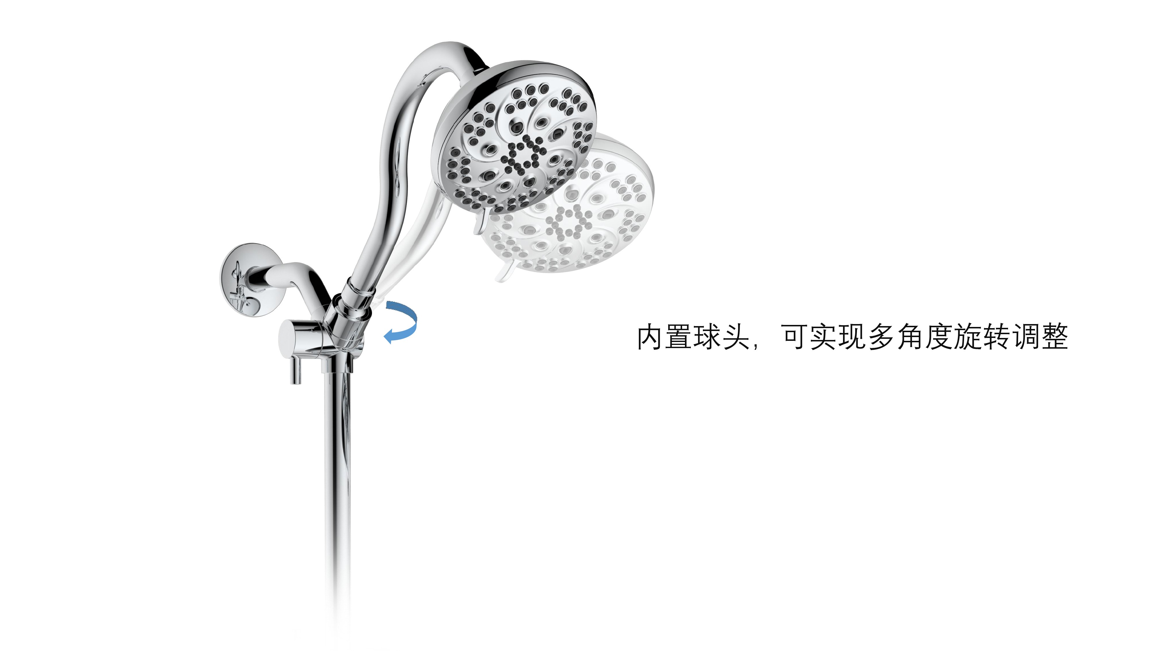 上出水彎管套裝;頂噴內(nèi)置球頭,可實(shí)現(xiàn)多角度旋轉(zhuǎn)調(diào)整;把手切換頂噴出水、花灑出水;轉(zhuǎn)動(dòng)把手調(diào)節(jié)滑座高低;8功能出水花灑